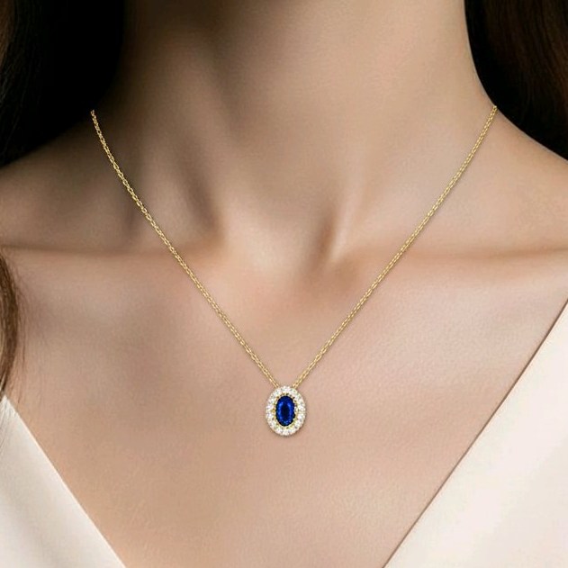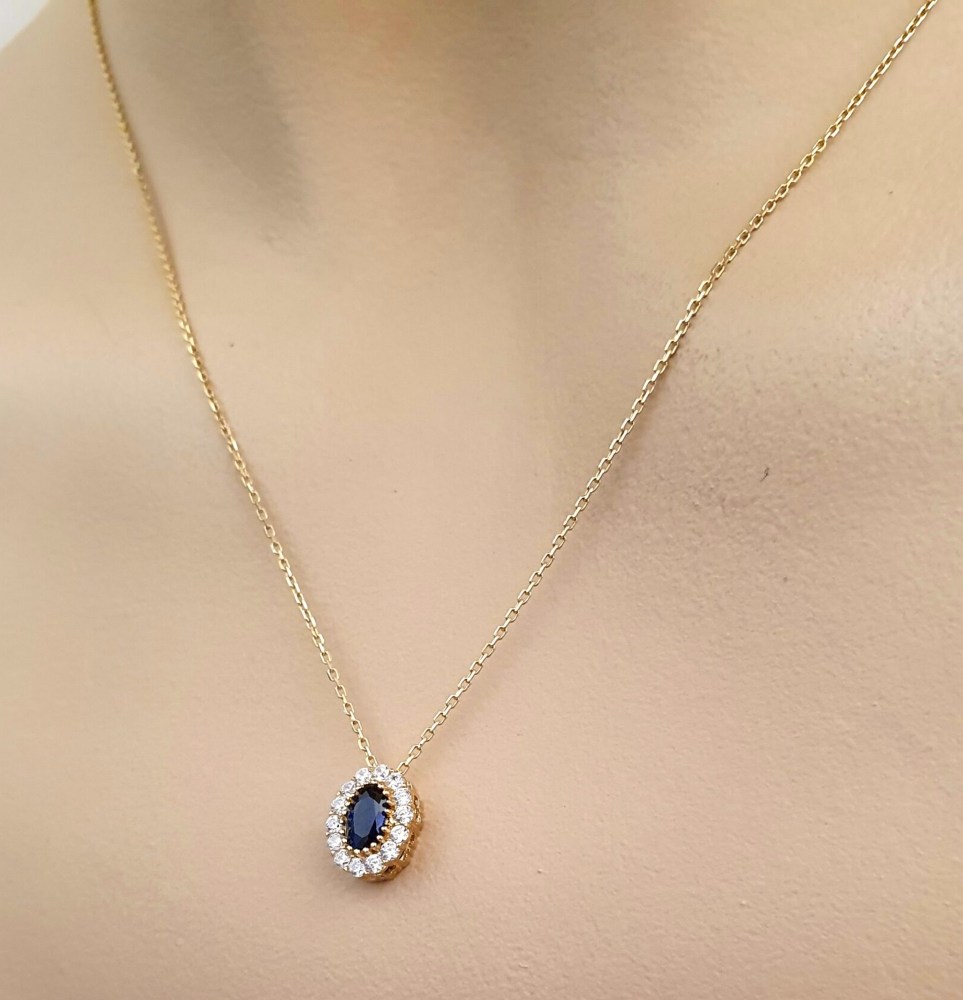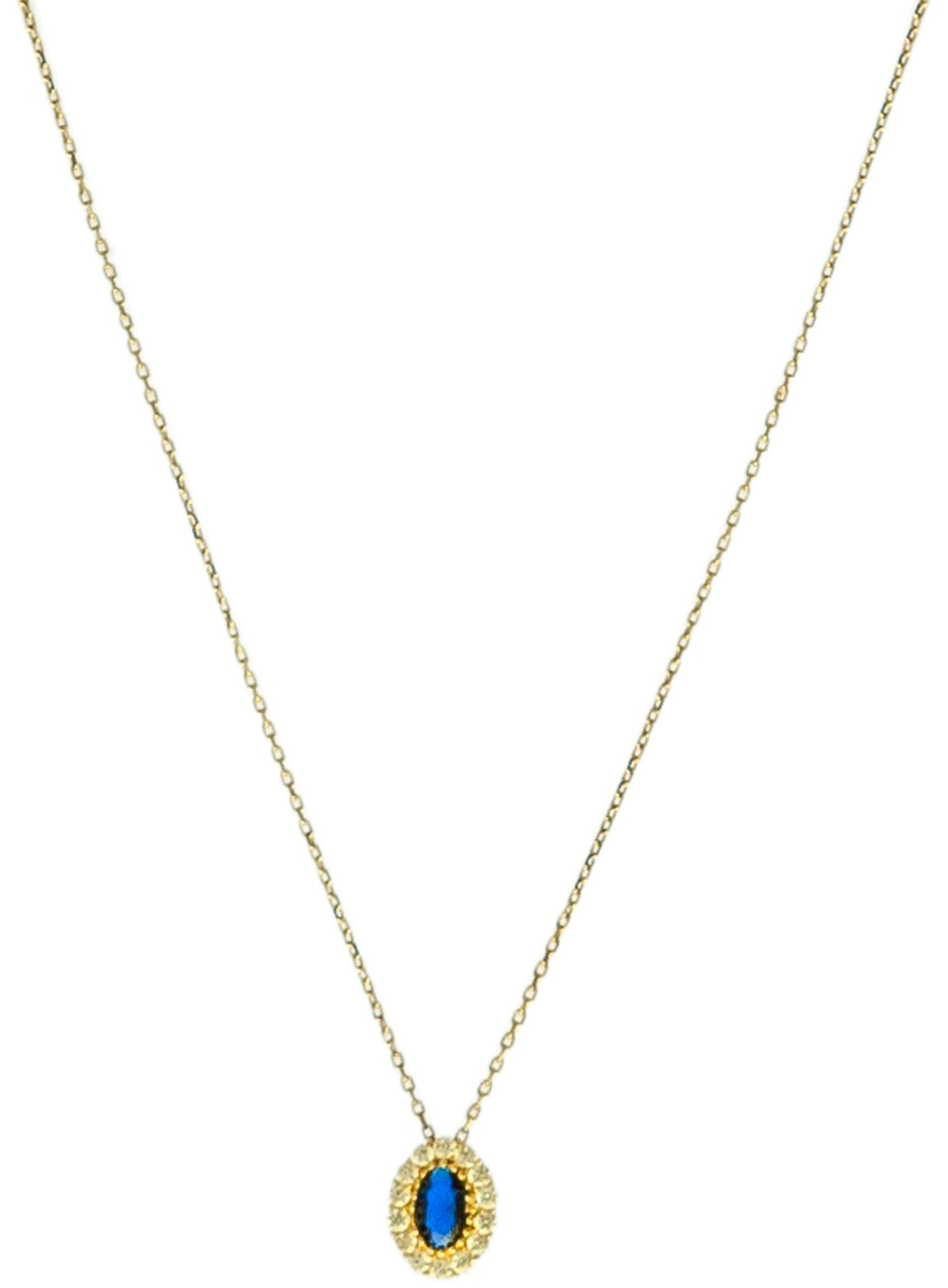 Χρυσό κολιέ οβάλ μοτίφ 9Κ με ζιργκόν K9.5116 / Χρυσό κολιέ οβάλ μοτίφ 9 καράτια στολισμένο με λευκά-μπλε ζιργκόν / K9.5116