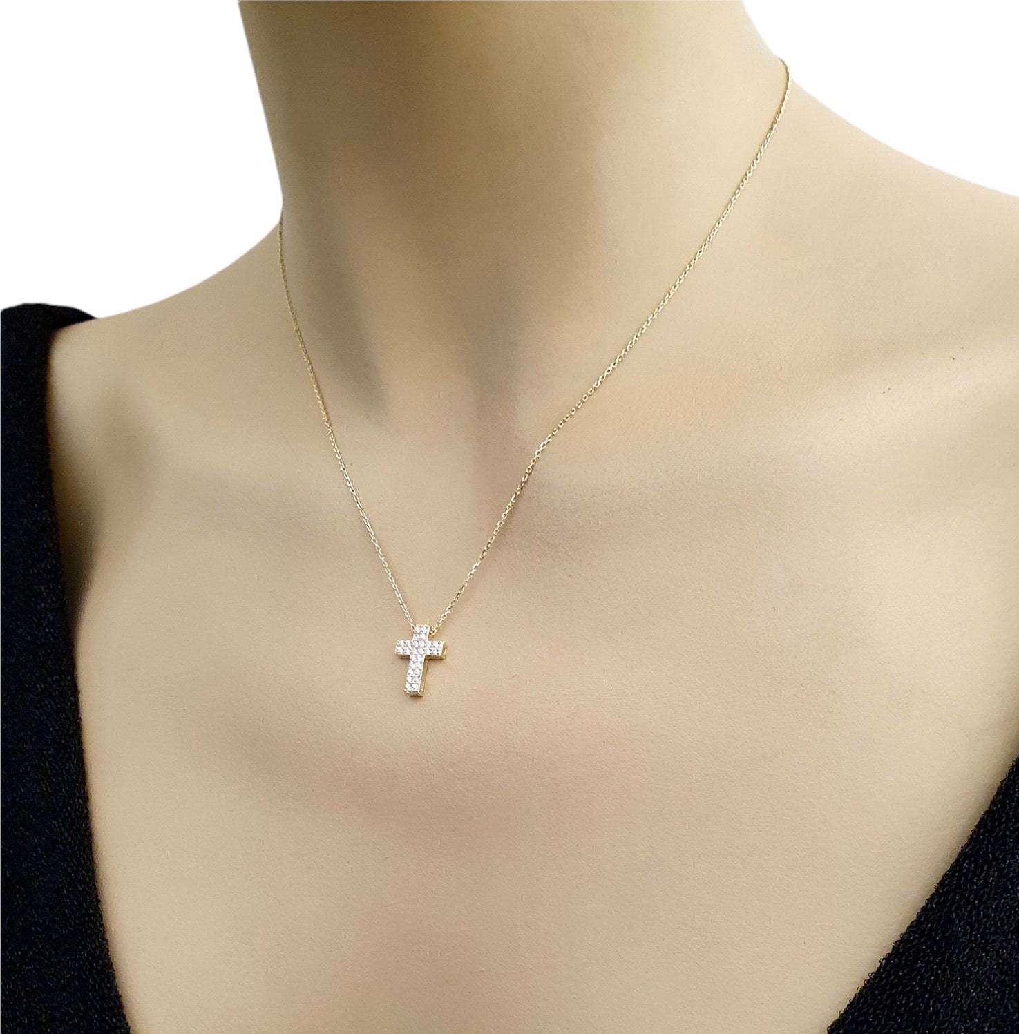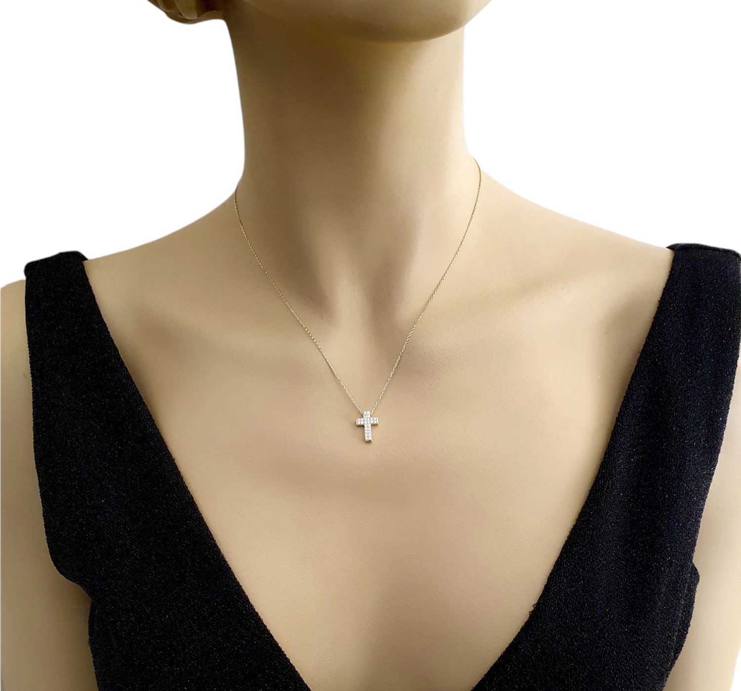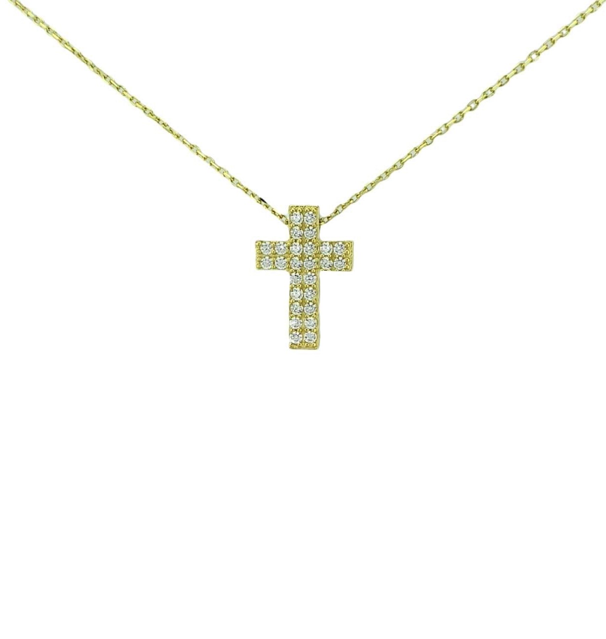 Χρυσό κολιέ σταυρός 9 καράτια στολισμένο με λευκά λαμπερά ζιργκόν.