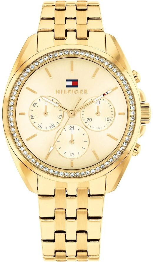 Tommy Hilfiger Ρολόι γυναικείο 1782803 / Γυναικείο ρολόι από την εταιρία Tommy Hilfiger. Το στρογγυλό καντράν, με το ατσάλινο μπρασελέ σε χρυσό χρώμα και τις διακοσμητικές πέτρες, κάνουν το ρολόι ιδανικό για καθημερινές άλλα και πιο επίσημες εμφανίσεις. Διαθέτει μηχανισμό μπαταρίας, ο οποίος βασίζεται στην ηλεκτρική ενέργεια που παράγει η μπαταρία, με αποτέλεσμα να υπάρχει ακρίβεια και αντοχή. Είναι ανθεκτικό σε ελάχιστη επαφή με το νερό (πιτσίλισμα) και θα πρέπει να αποφεύγεται οποιαδήποτε μεγαλύτερη επαφή μαζί του